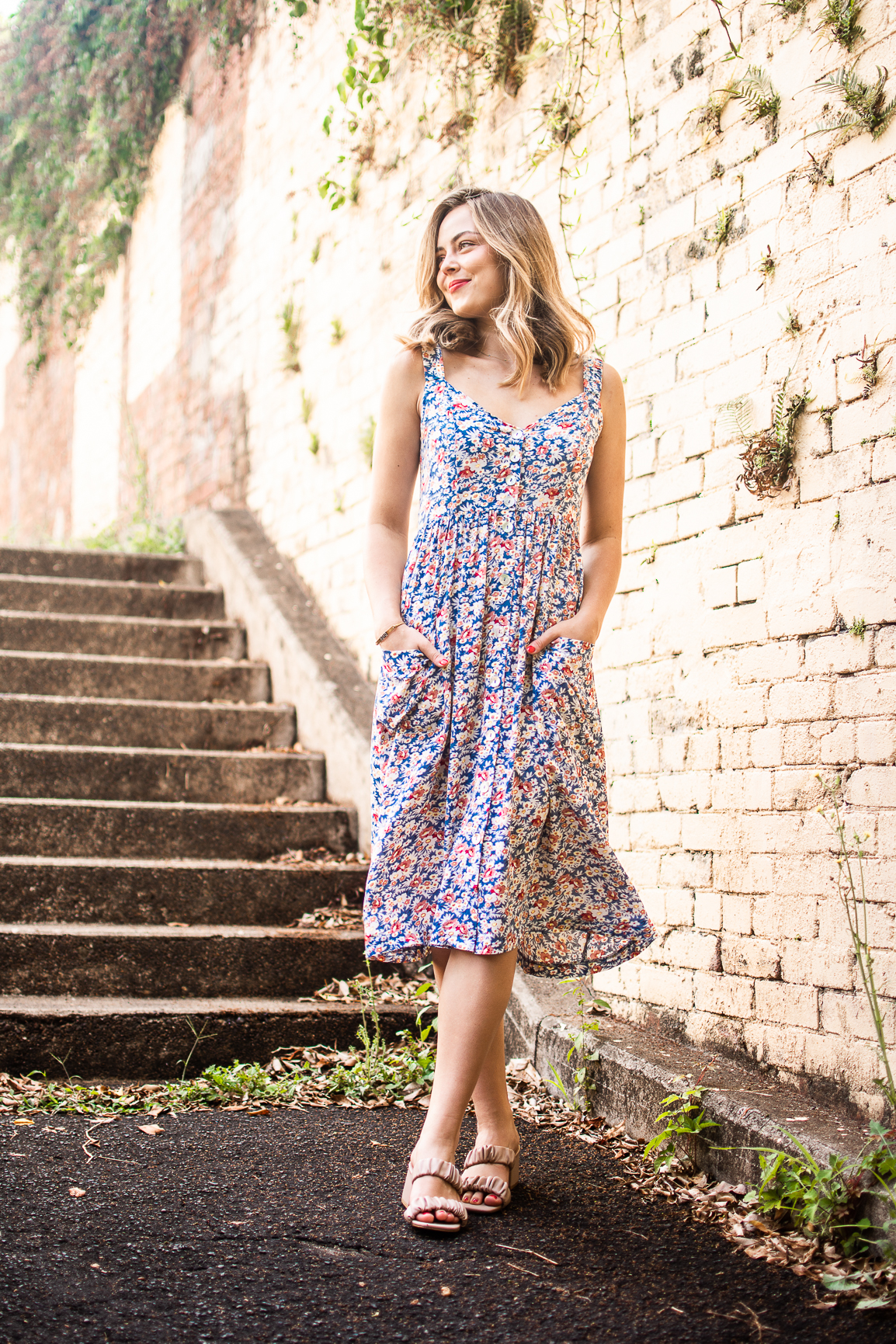 Rayon button though, strap dress with pockets in floral print.
