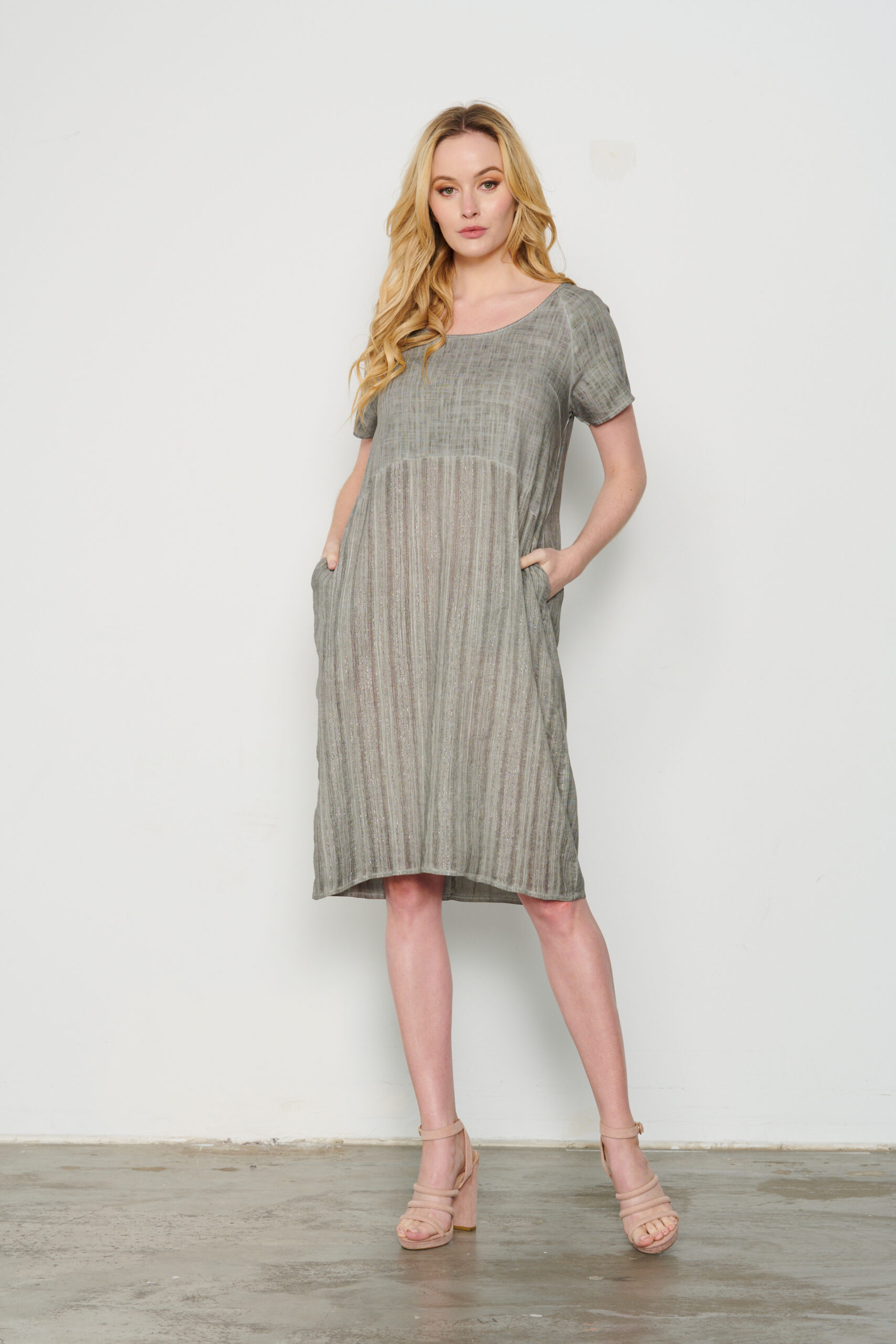 Linen dress with striped lurex panel (rayon panel) in front with pockets