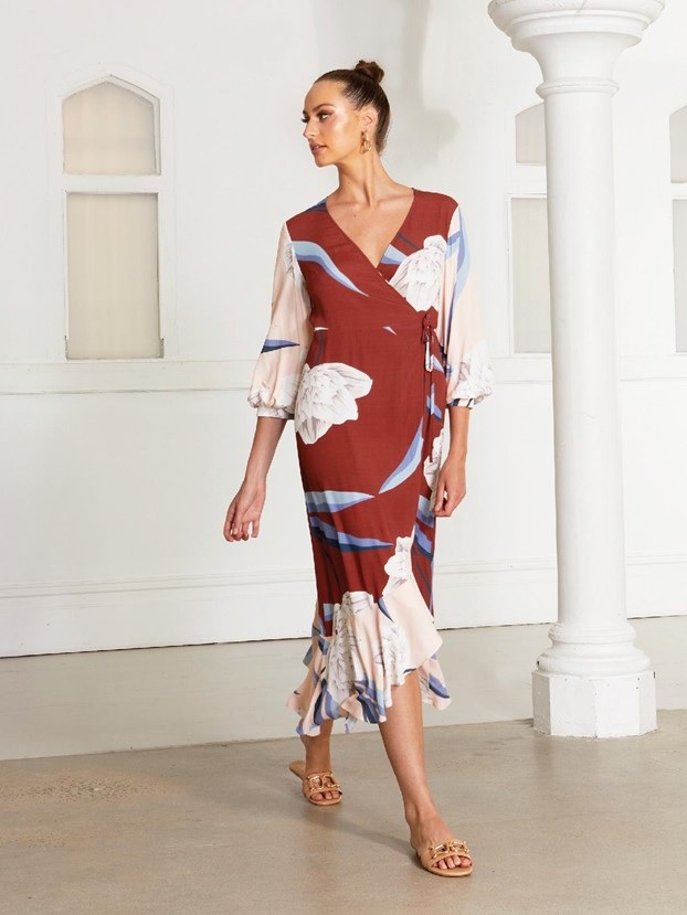 Another Fate + Becker all-time favourite returns, this gorgeous wrap dress is for the ultra-femme at heart. Featuring a V neckline, sweet balloon sleeves and extra volume in the skirt, it doesn’t come more flattering than this. The stunning peony print is designed to transition into the cooler months with your favourite jacket and ankle boots.